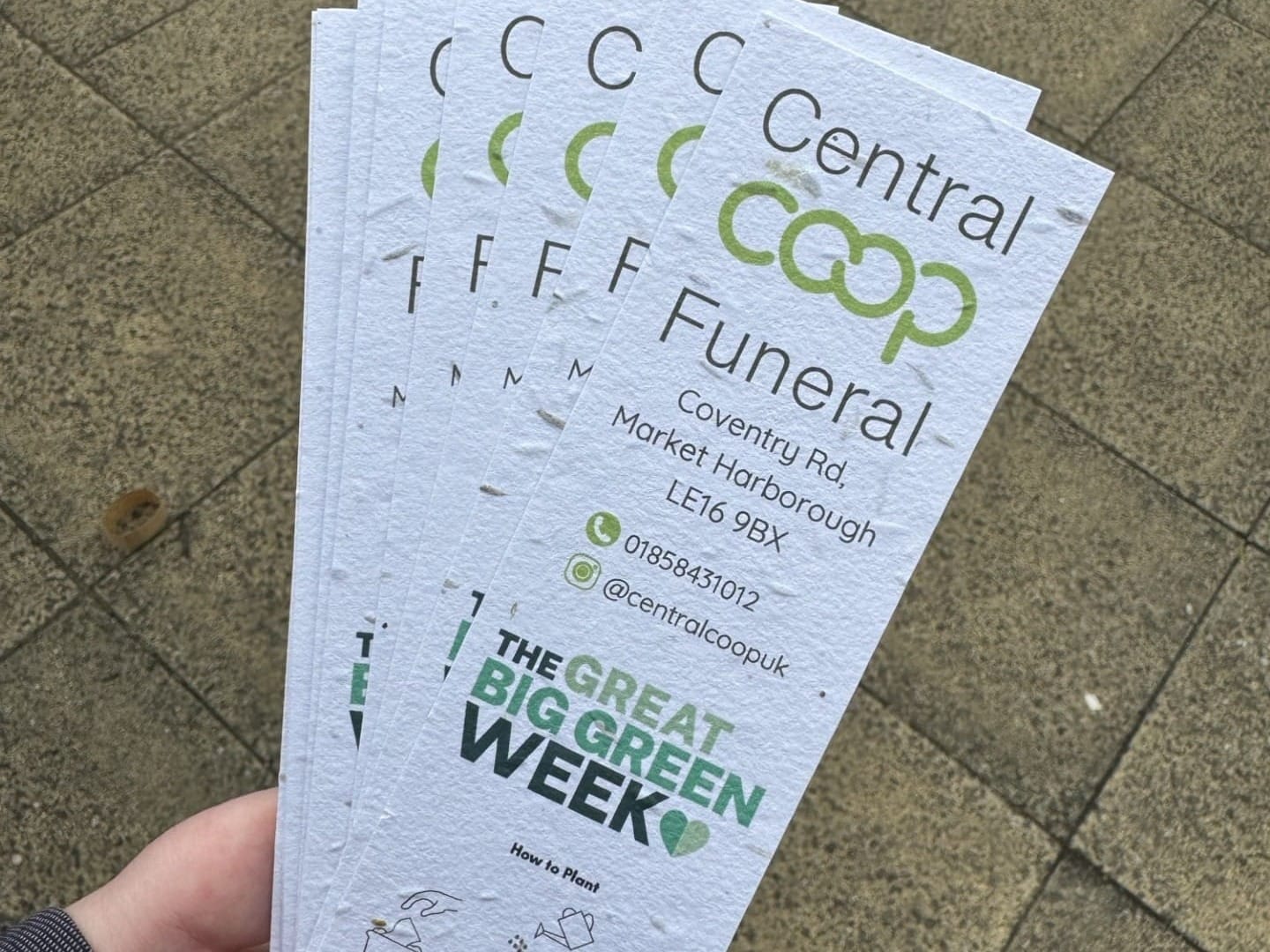 Our funeral home in Market Harborough took part in the Great Big Green Week by hosting a special eco-event on Wednesday the 12th of June, at The Square in Market Harborough. Our electric Mustang fleet was on display, demonstrating the sustainable swaps families can make to ensure a lasting, positive legacy for their loved ones and the planet. The team handed out packets of seeds and provided insights into sustainable funerals, aiming to break the stigma and mystery around funeral homes.