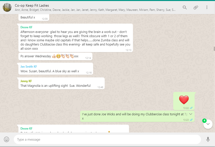 Desne, our Keep Fit Tutor, and Jayne who attends her classes, have been busy keeping members who attend the classes occupied and this is what they had to say: Attached are some screenshots of our conversations in the Whatsapp group. There are 20 of us in it, some others haven't got access to Wha...