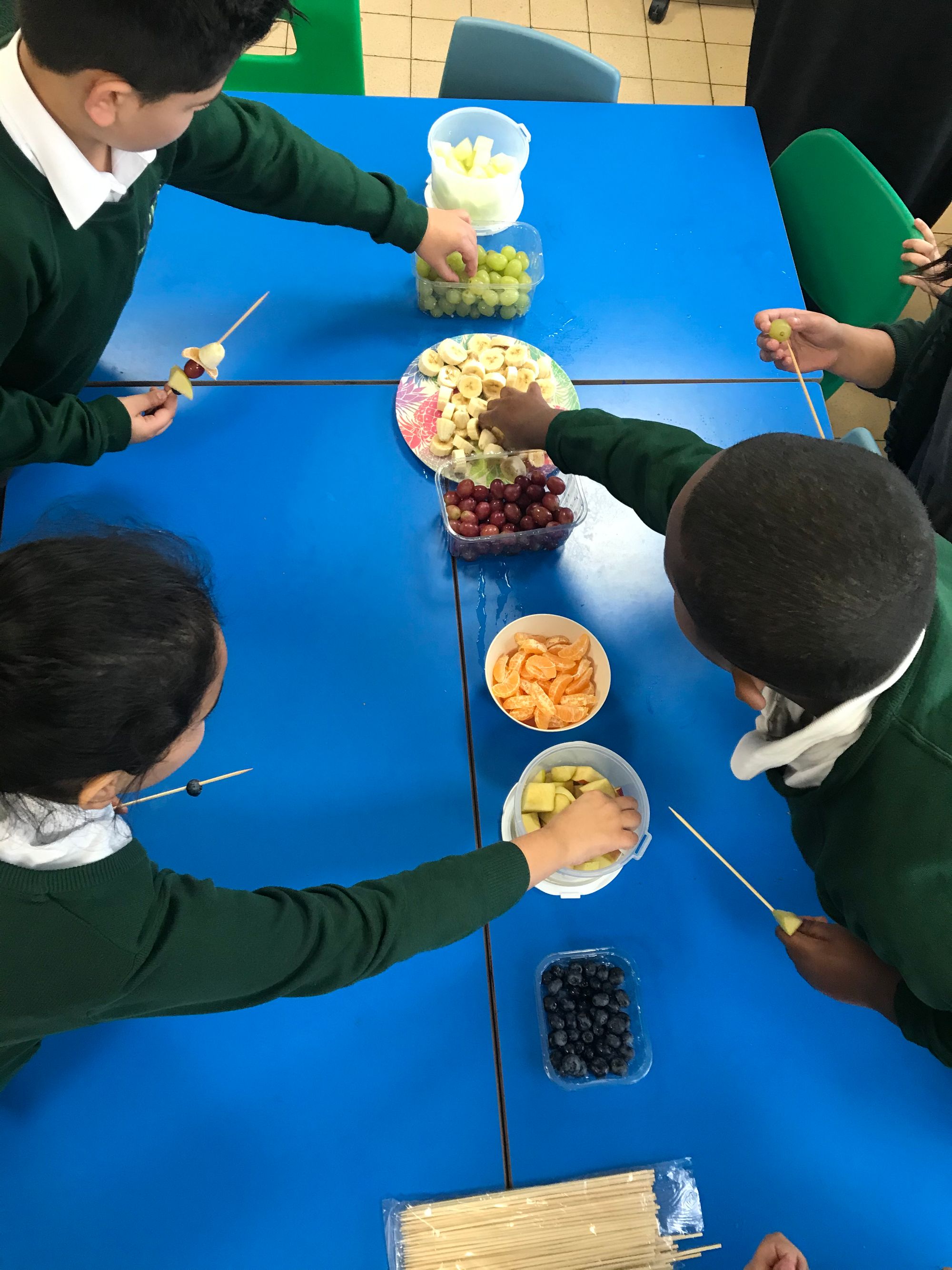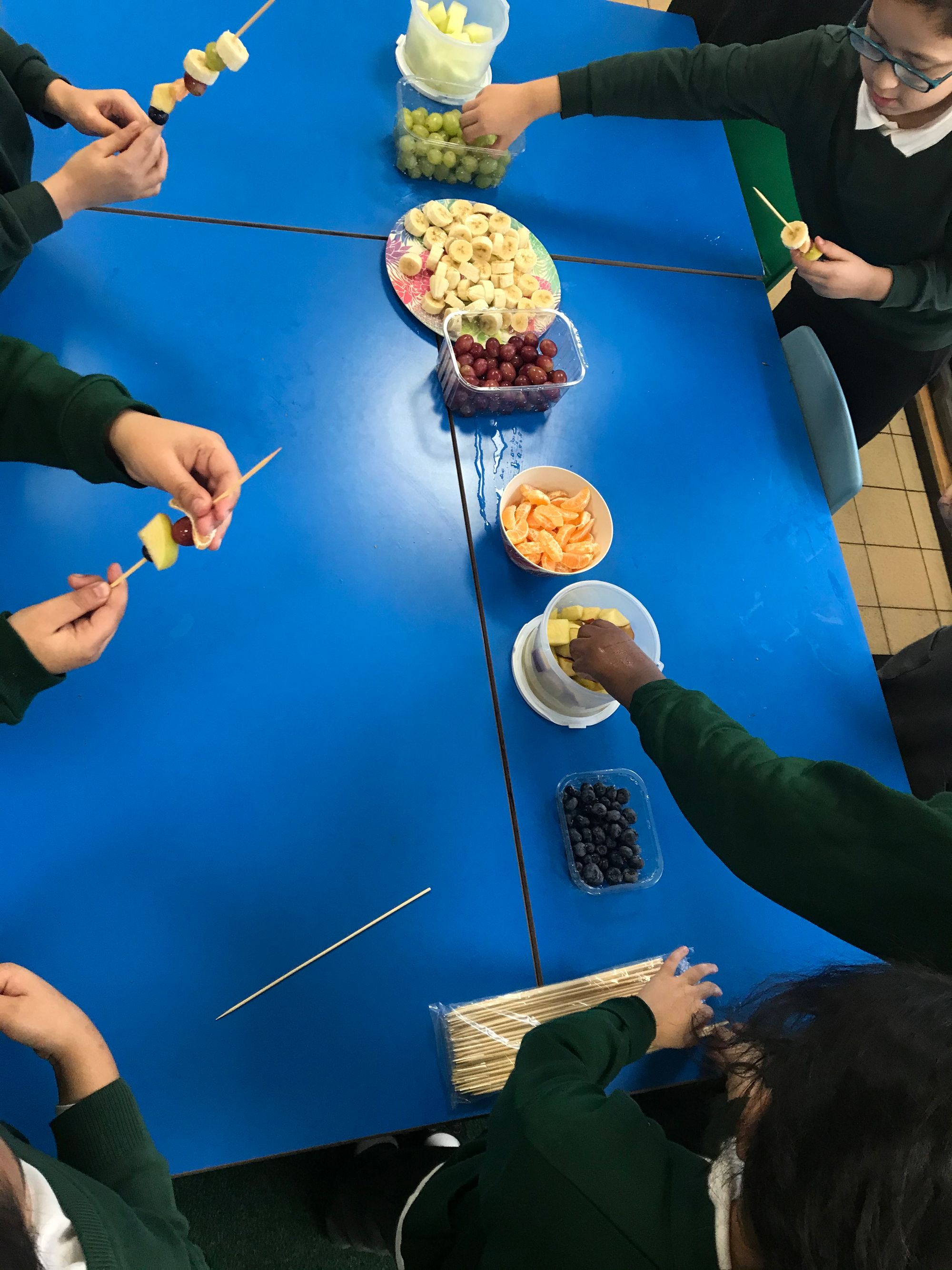 After each of the sessions, the students were invited to make fruit kebabs, this fun activity not only allows the students to have some fun but also eat some different fruits, backing up the message that mixing fruits, vegetables and colours is always best in a healthy '5 a Day' diet.