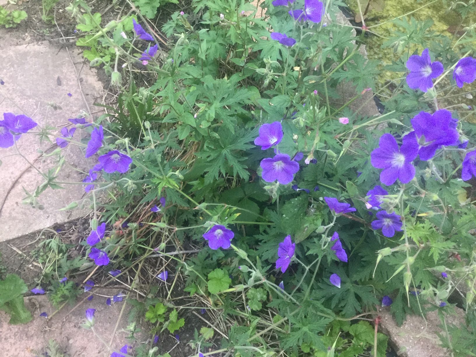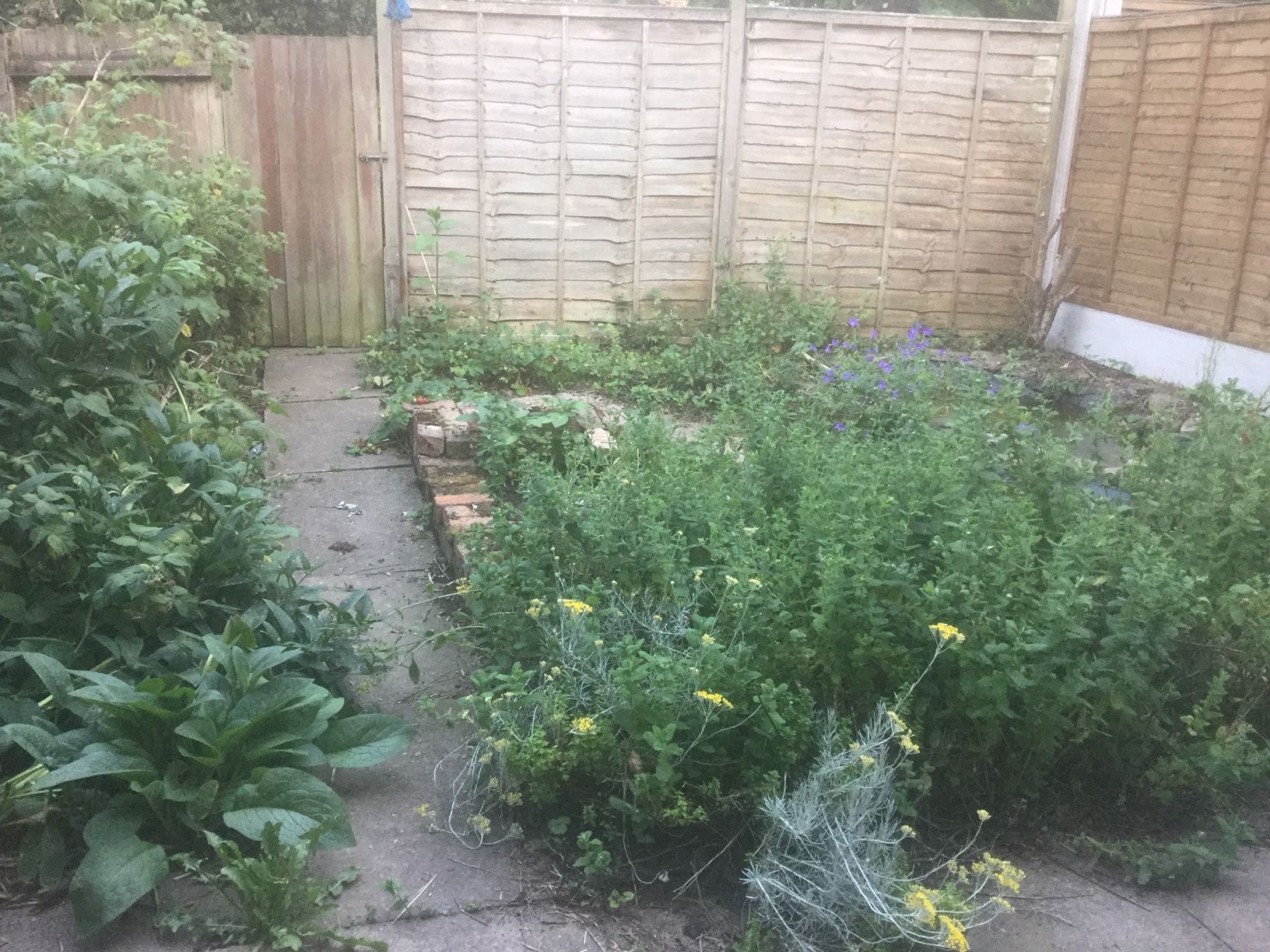 The tour went from left to right. By the left fence are Comfrey and Raspberries. They are both nature friendly and deal well with tough conditions. Initially the Comfrey reigned supreme and enveloped the garden, but the Raspberries have fought back and now dominate this part of the garden. In the middle section of the garden there is a raised bed, built from reclaimed bricks in the alley behind the garden and an herb spiral, the unfortunately, and predictably, the herb spiral was hidden from view by mint, which had grown out of control. Next to the mint are Gooseberries. At the back of the fence are Strawberries, some of which are ready to eat. At the back right of the garden is a pond. The pond has had Frogs in it but is now dominated by Algae. Gardening club member Trace gave me some advice as to how to combat this. I will investigate buying some plants that can help. Sue was able to solve the mystery about what the purple flowers in my garden are. It turns out that they are Geraniums. They’d been planted by me years ago, but I had no idea what they are. I also talked about some of the materials that had been repurposed, like a regular Bin that we found in the garden and turned it into Compost Bin. I’d also been given tyres from a school and used them as pots for plants, including a Tomato and a Courgette Plant.